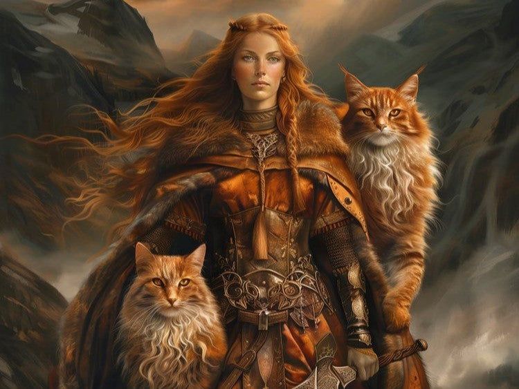 The goddess Freyja, known for practicing witchcraft and in charge of death and the afterlife, was depicted riding a chariot pulled by magical cats.