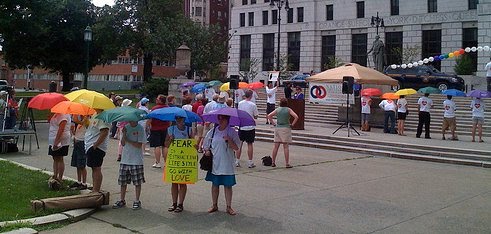 By Eden James Wow. You’ve got to hand it to the equality movement. Our collective response to the NOM Tour just keeps getting better and better with each tour stop. First, the Equality Maine and GLAD organizers of the Maine counter-rally to NOM actually attracted more people to their event than NOM’s kickoff event on Wednesday (102 to 76 by our hand-count). Then the New Hampshire counter-rally organizers held a brilliant “silent witness” event across the street from the Manchester event on Thursday. And now the amazing Albany organizers, led by several wonderful organizations, have taken counter-protesting to a whole new level, surrounding the NOM event with one of the most brilliant actions I have ever seen. Check out the gathering storm of rainbow umbrellas held aloft by equality movement activists silenting protesting NOM while asking a simple question adorned to their t-shirt: “Do you see my love?” NOM Executive Director Brian Brown (above) doesn’t look too happy, does he? How could he? It’s fair to say that Albany turned into yet another NOM FAIL, due to the beauty of creative counter-protest and the paltry NOM attendance (Danny hand-counted 57 attendees). Courage staffers Danny and Robert will be writing up their reports later, but for now, take note of this Albany protest. One thing is for sure — local organizers at subsequent counter-protests are going to have a hard time topping this poignant and powerful action. Can’t wait to see what they can do. Again, here are the amazing organizations that made this counter-protest possible today (from a press release): Marriage Equality New York In Our Own Voices Capital District Gay & Lesbian Community Council Albany Queer Rising HomoRadio on WRPI 91.5fm Empire State Pride Agenda Freedom to Marry Courage Campaign Social Responsibilities Council of the First Unitarian Universalist Society of Albany Upper Hudson Planned Parenthood Eleanor Roosevelt Democratic Club (ERDC) New York Civil Liberties Union (NYCLU) Capital Region Chapter Albany Law School Civil Liberties Union Choices Counseling & Consulting/The Institute for Gender, Relationships, Identity & Sexuality GAES Magazine: Gay Arts, Entertainment & Lifestyle The Women’s Building Christians Responding with Equality, Diversity and Openness (CREDO) of the Capital District National Organization for Women (NOW) Albany Area Chapter Capital District Area Labor Federation