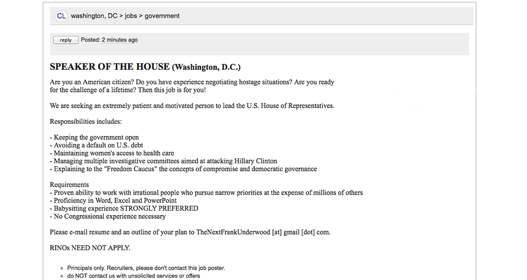 "Rep. Mark Takano’s (D-Calif.) created a fake ad for “Speaker of the House” that they posted on Craiglist on Thursday night, likely met with a tidal wave of high-faves from his staffers." https://pbs.twimg.com/media/CQ0sAwYWoAETIgY.png:large LOL @ "Managing multiple investigative committees aimed at attacking Hillary Clinton." |