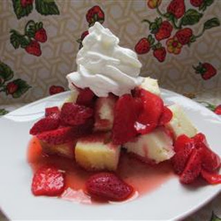 Vanilla pound cake topped with strawberries and whipped cream |